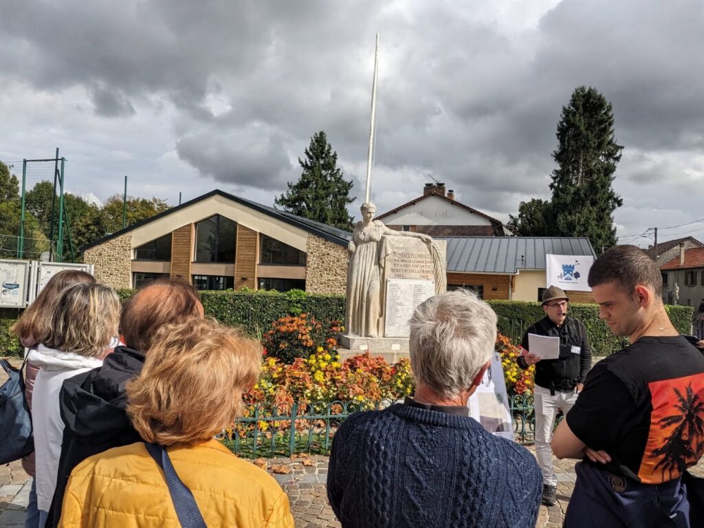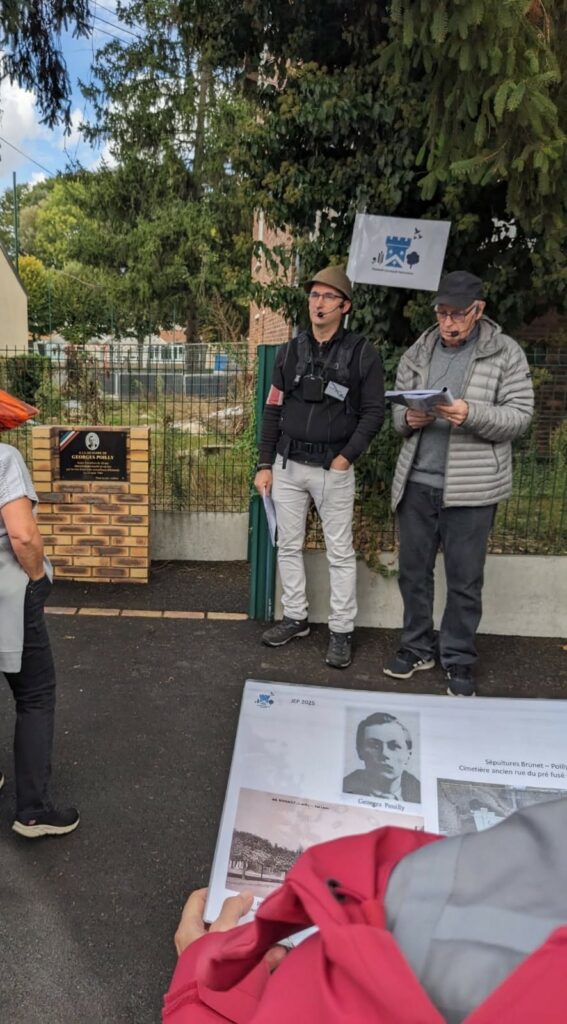 Après un bref historique du monument aux morts et attiré l’attention sur la plaque relative aux victimes de la Seconde guerre mondiale (11 militaires et 14 personnes civiles) le groupe s’est dirigé vers la stèle de Georges POILLY dans la rue Gilbert Rey, puis par le passage Crapart-Nacu pour rejoindre la rue de la Libération.